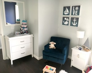 After Thanksgiving, I knew it was only a matter of time until the bathroom would be finished, and I’d need to start thinking about the baby’s room. Choosing a crib was a lot harder than I thought it would be. I just couldn’t make up my mind. I thought I wanted something completely different than the cribs we had for the twins, so I kept searching. Here’s the thing though, when I thought about a crib, I thought about all of the excitement and joy we had putting together the twins’ cribs and then my next thought was always the horror of standing in the return line at Target with two carts and two cribs. I just did not want to go through it again, so I was trying to put it off all together. In the end, I came full circle and with some loving nudges from Nick to hit the purchase button, we ended up choosing something that was very similar to the twins’ cribs. The bedrooms in our house are not big, at all, and we’ve said many times that’s not why we bought this house. We fell in love with our house because of the great room (the open concept living room, dining room and kitchen) that looks out at Lake Champlain and the Adirondack Mountains. Since that tiny bedroom wasn’t going to be jam packed with cribs this time, we decided we had room for a rocking chair or glider. I had my eye on this navy-blue velvet glider that was probably way overpriced and sold online only. Ugh. I wasn’t sure if I even needed it, but once Nick saw the chair and read the brand, “Abbyson” it was game over. He insisted on putting the chair in the cart, because the chair was indeed for Abby’s son. So, we did it. We ordered nursery furniture and it was set to arrive the weekend of my birthday. How perfect!